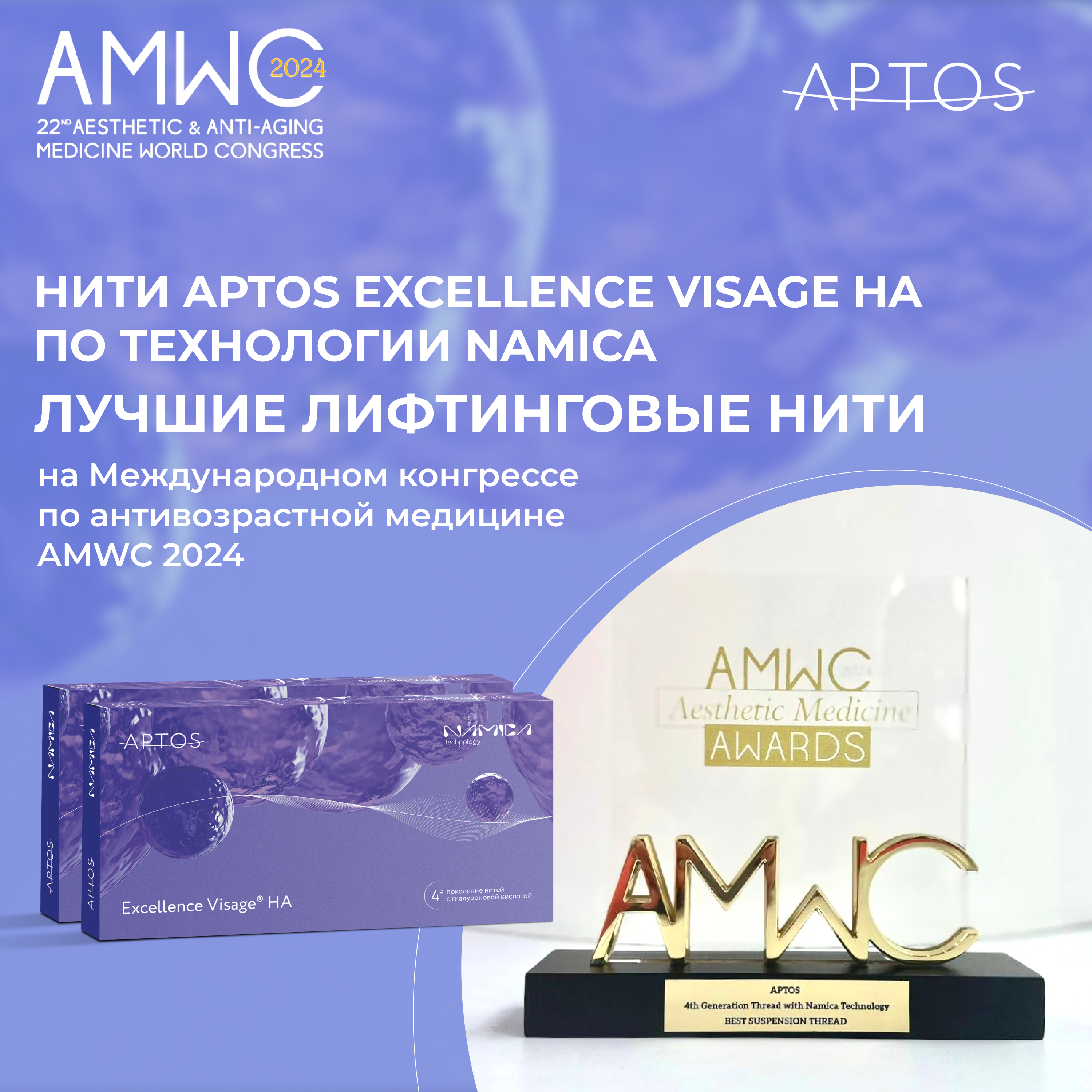 Компания APTOS стала призером XXII Международного конгресса по эстетической и антивозрастной медицине (AMWC 2024), который проходит с 27 по 29 марта в Монте-Карло, Монако. В рамках конгресса по традиции прошло вручение престижной премии AMWC Aesthetic Medicine Awards. Победа в номинации «Лучшие лифтинговые нити» (Best Suspension Thread) была присуждена нитям APTOS 4-го поколения по технологии NAMICA!