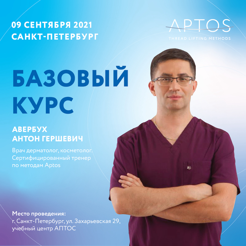 Компания APTOS приглашает практикующих врачей-косметологов и пластических хирургов на базовый курс тренера Антона Гершевича Авербуха в Санкт-Петербурге. Курс состоится 9 сентября 2021 г и будет включать в себя теоретическую и практическую части.