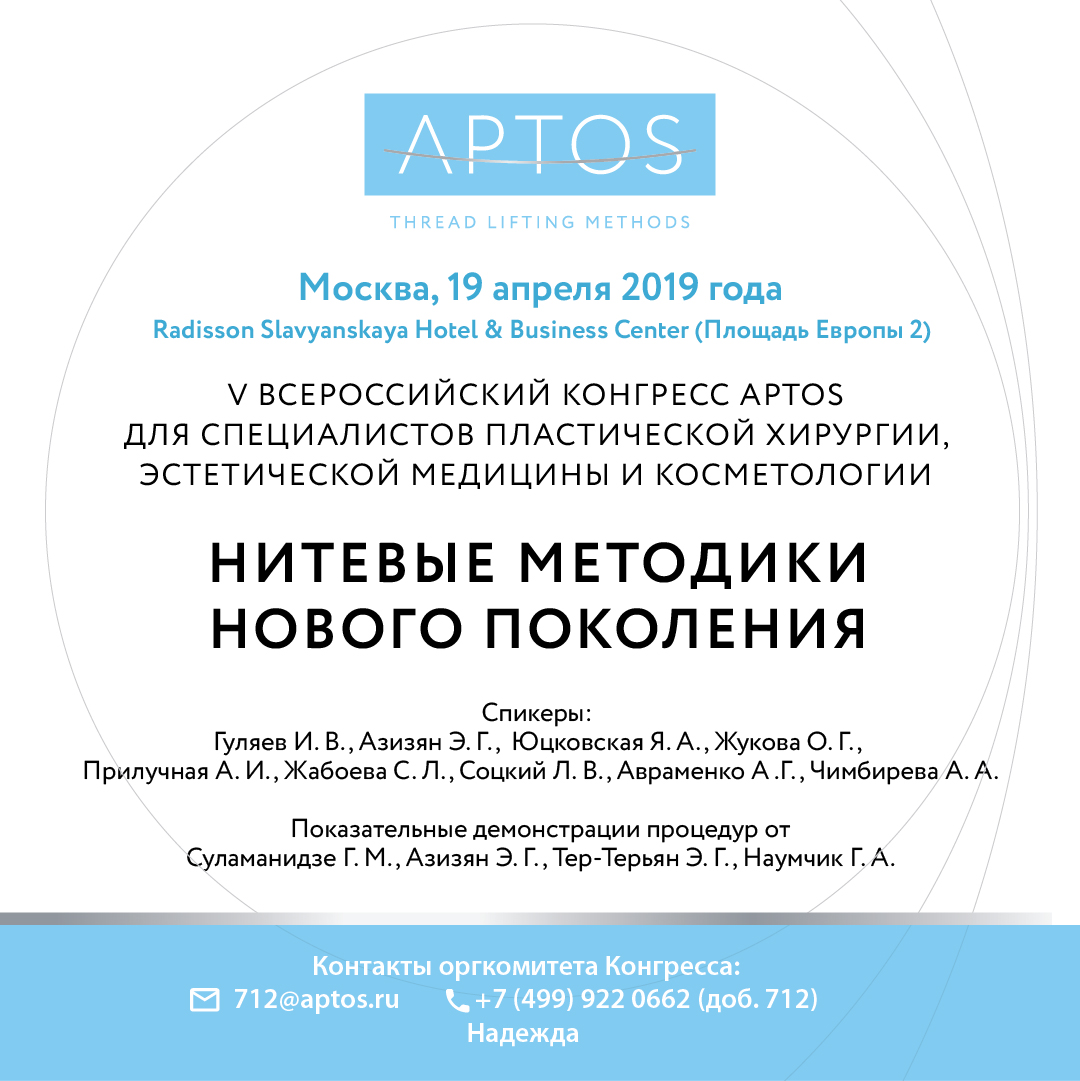 Приглашаем вас на V Всероссийский Конгресс APTOS для специалистов пластической хирургии, эстетической медицины и косметологии «Нитевые методики нового поколения», который состоится 19 апреля в г. Москва!