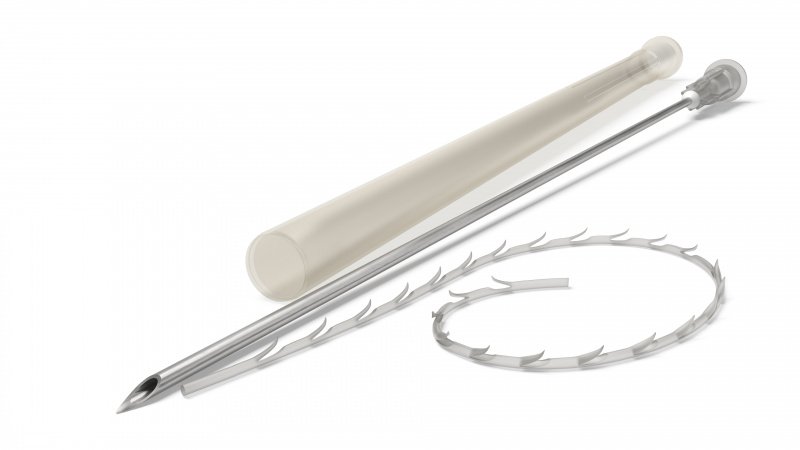 Рассасывающаяся нить с насечками вводится подкожно, с помощью иглы-проводника протягивается через мягкие ткани и выводится в нужной точке.