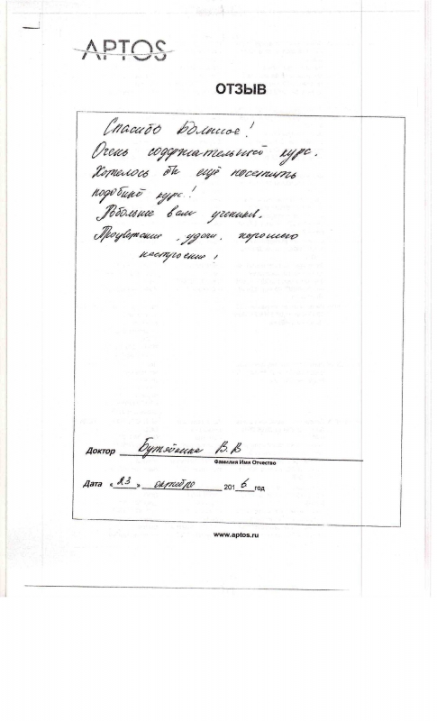 Обучение очень интересное, буду советовать вас всем своим коллегам. Отдельное спасибо Гуляеву Игорю Валерьевичу и Сергее... Обучение очень интересное, буду советовать вас всем своим коллегам. Отдельное спасибо Гуляеву Игорю Валерьевичу и Сергеенко Андрею Евгеньевичу. Они – тренеры по методикам Aptos от Бога. Планирую вернуться на дополнительное обучение еще раз к ним.