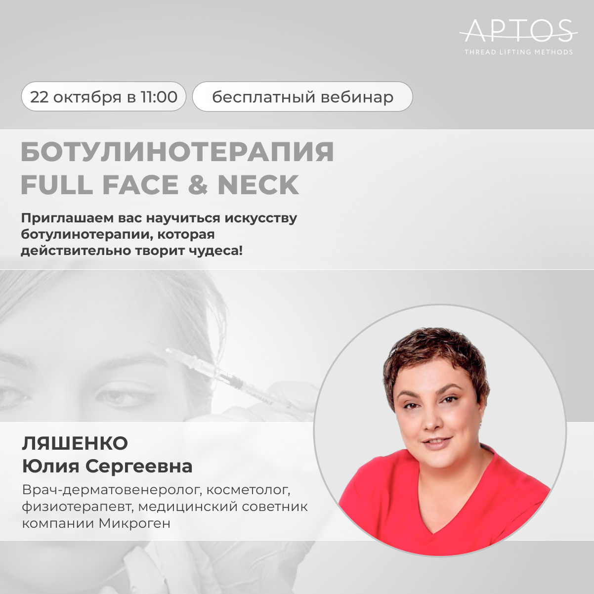 Приглашаем вас на онлайн-практикум из процедурной АПТОС «Ботулинотерапия Full Face & Neck»!