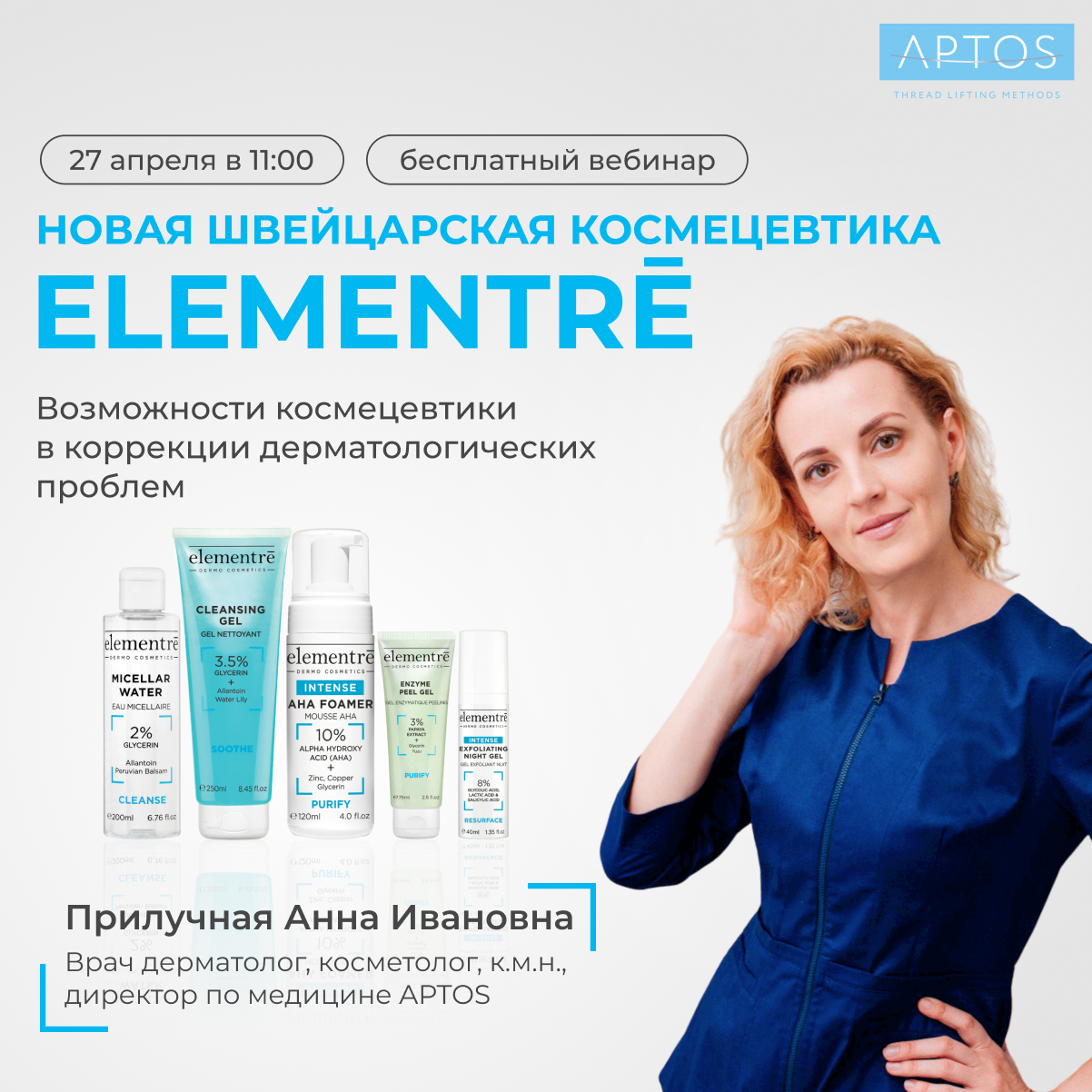 Уважаемые коллеги! Приглашаем вас на бесплатный вебинар «Возможности космецевтики в коррекции дерматологических проблем. Новая швейцарская космецевтика elementrē — эксклюзивно в АПТОС»!